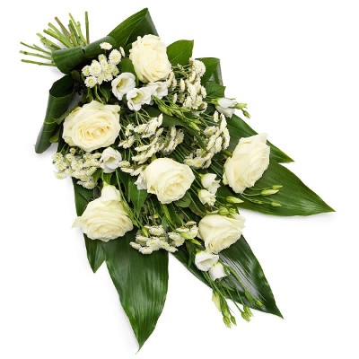 Hvit bårebukett med roser, texasklokker og krysantemum med grønt. Husk å legge til bånd om du ønsker at din hilsen skal bli lest opp i kirken.